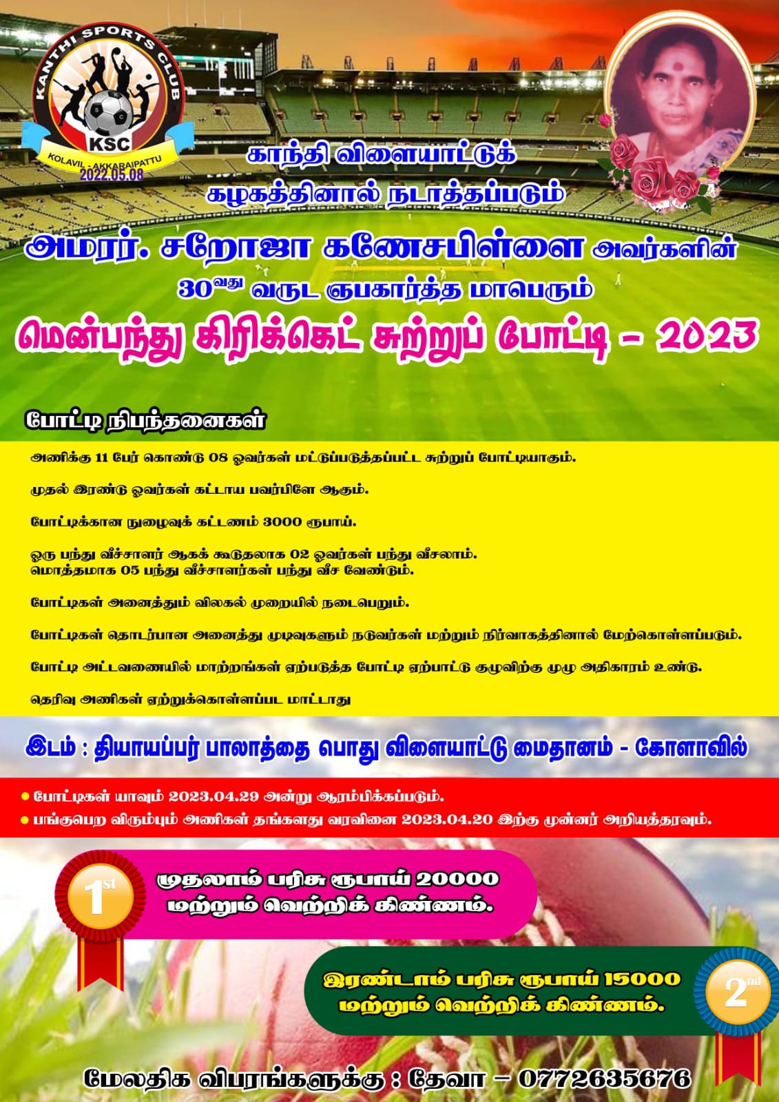 அமரர்.சறோஜா கணேசபிள்ளை 30வது வருட ஞாபகார்த்த மாபெரும் மென்பந்து கிரிகட் சுற்றுப் போட்டியின் இறுதிப்போட்டி எதிர்வரும் 14 அன்று….
