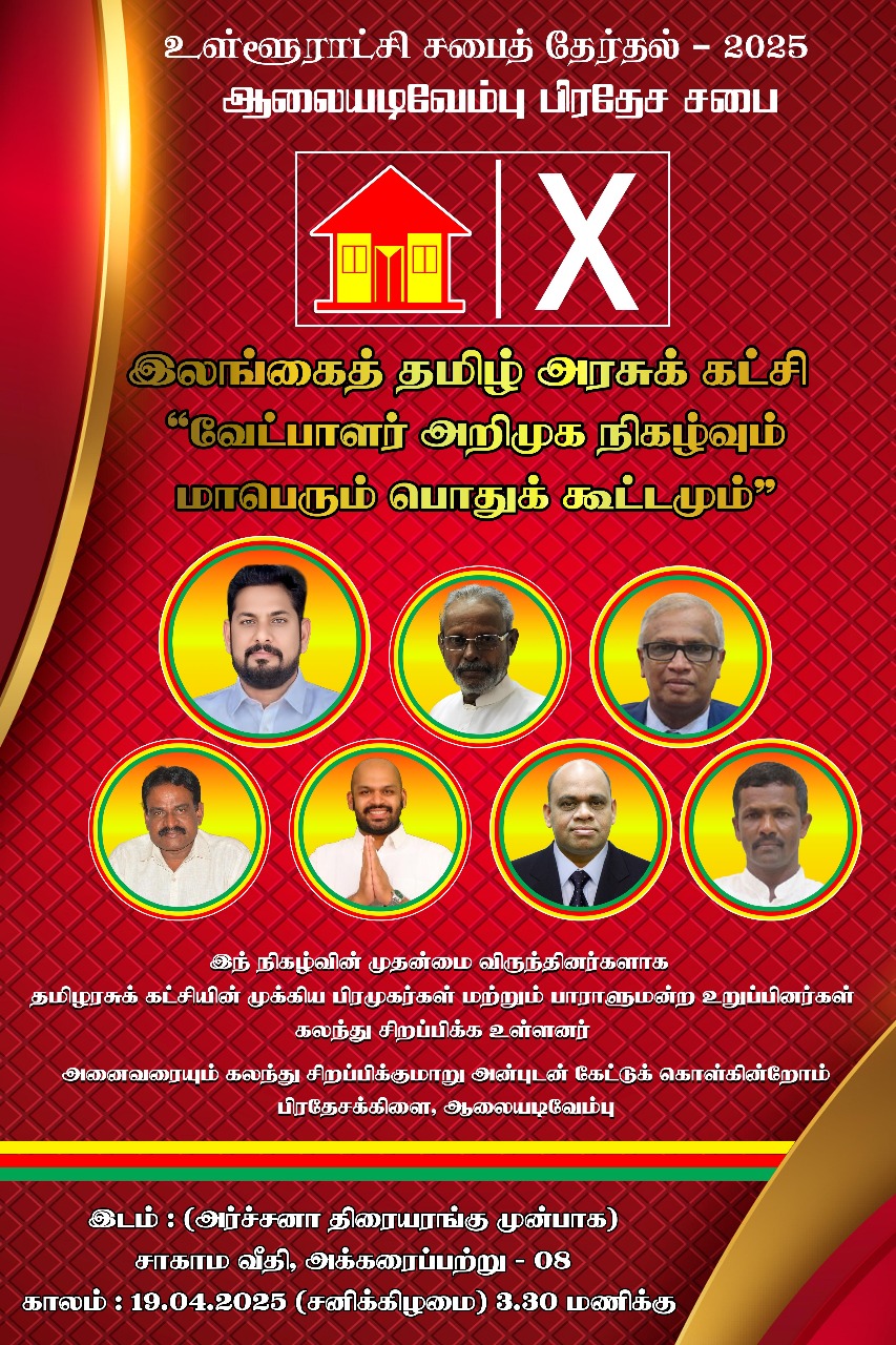 இலங்கை தமிழ் அரசுக் கட்சியின் ஆலையடிவேம்பு பிரதேச சபை தேர்தலில் போட்டியிடும் வேட்பாளர்கள் அறிமுக நிகழ்வும் மாபெரும் பொதுக் கூட்டமும் எதிர்வரும் 19.04.2025 பிற்பகல் 3:30 மணிக்கு சாகாம வீதி, அக்கரைப்பற்று – 08 அர்ச்சனா திரையரங்கு முன்பாக இடம்பெறும் என்பதனை அறியத்தருகிறார்கள் ஏற்பட்டு குழுவினர்.