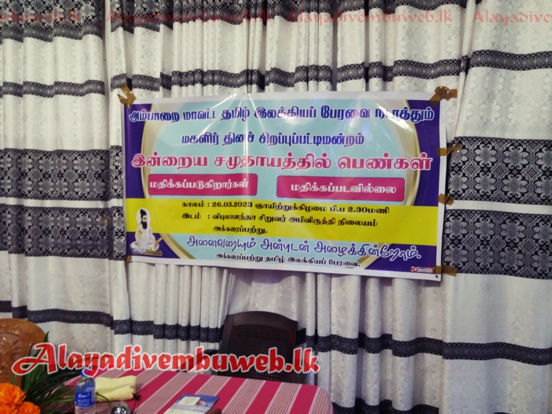 சர்வதேச மகளிர் தினம் மார்ச் 08ஆம் திகதி உலக அளவில் அனுஷ்டிக்கப்பட்டு இருந்த நிலையில் அதனை சிறப்பிக்கும் முகமாக அம்பாறை மாவட்ட தமிழ் இலக்கியப் பேரவை நடாத்தும் மகளிர் தின சிறப்பு பட்டிமன்றம் இன்று (26.03.2023) ஞாயிற்றுக்கிழமை பி.ப 2.30 மணிக்கு அக்கரைப்பற்று, விபுலாந்தா சிறுவர் அபிவிருத்தி நிலையத்தில் திரு K.கிஷ்ணமூர்த்தி (தமிழ் இலக்கியப் பேரவைத் தலைவர்) அவர்களின் தலைமையில் சமூகத்திற்கு பயன்மிக்கதாக மிகவும் சிறந்த முறையில் இடம்பெற்றது.