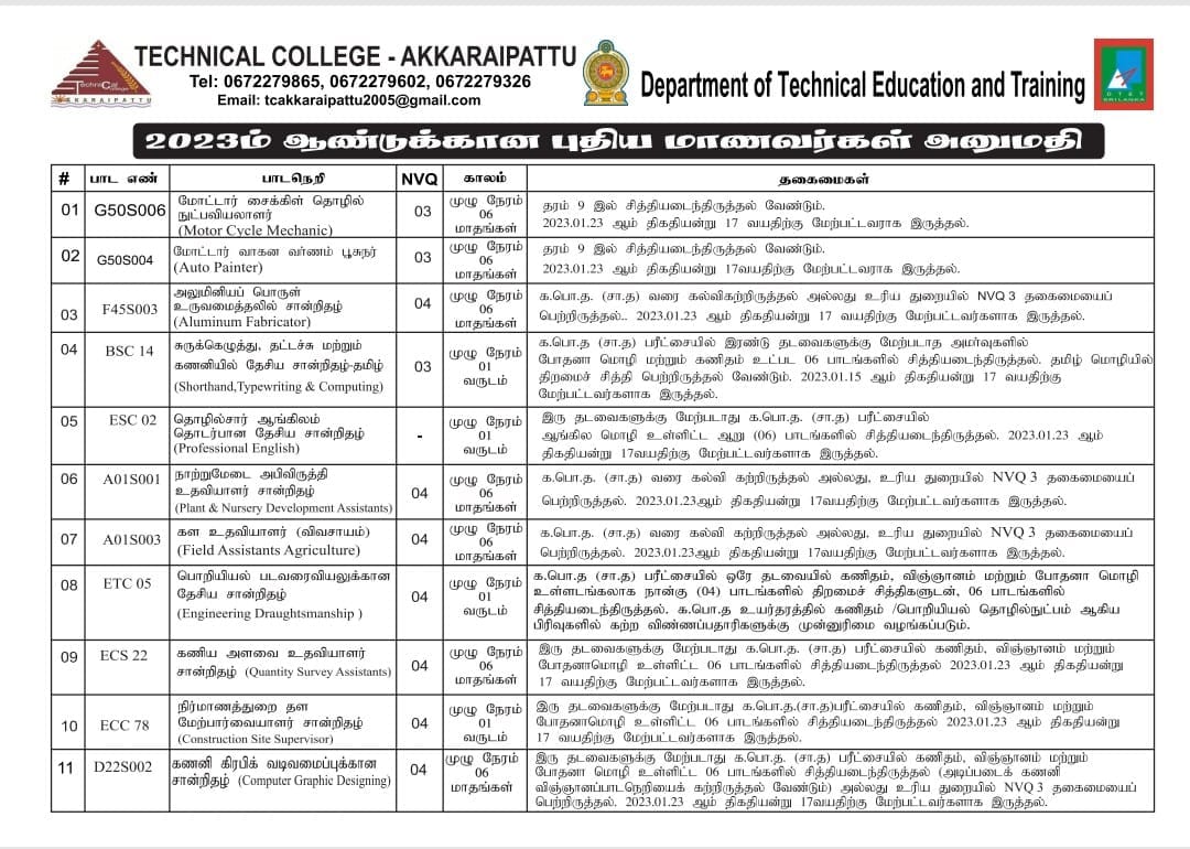 அக்கரைப்பற்று தொழில்நுட்பக் கல்லூரியில் 2023 ஆம் ஆண்டில் தங்களுக்கு பொருத்தமான துறை சார் பாடநெறிகளை பயில விரும்பும் மாணவர்கள் கீழ் குறிப்பிடப்படும் பாடநெறிகள் தொடர்பான தகவல்களுக்கு ஏற்ப…